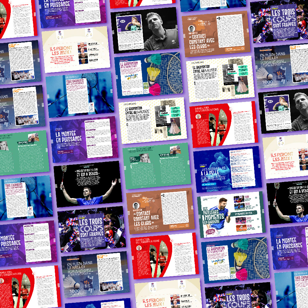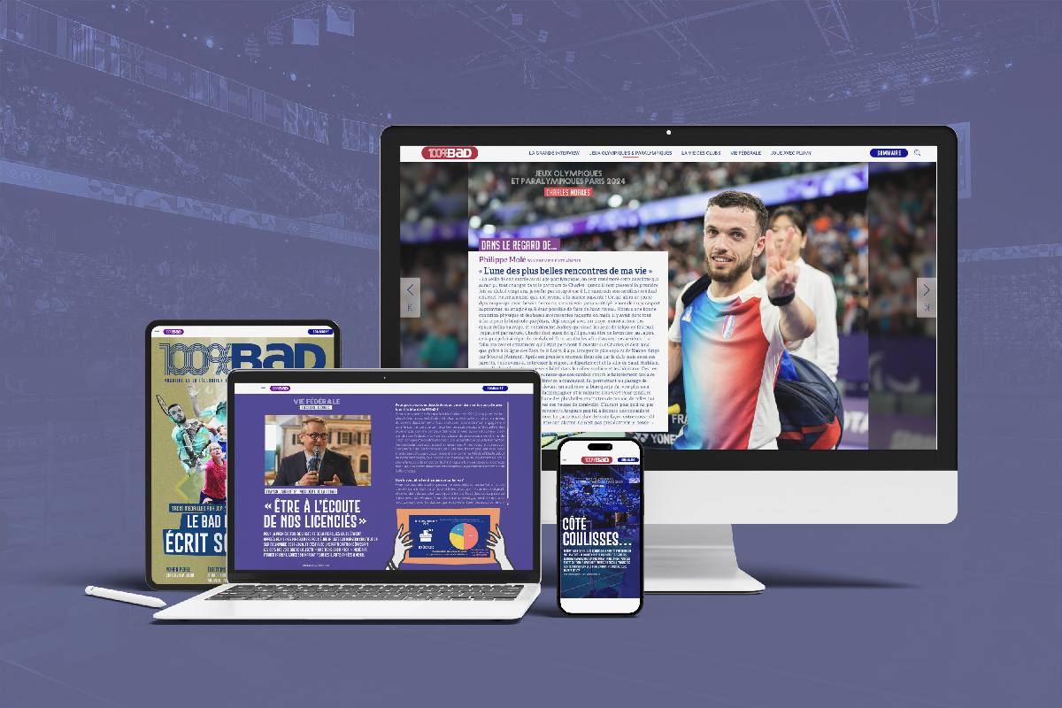 100% BAD est le magazine officiel de la Fédération Française de Badminton. Il a beaucoup évolué au fil du temps pour suivre les nouvelles habitudes de lecture. D’abord publié en version papier de 32 pages, il est désormais proposé également en version numérique interactive, pour toucher un public plus large et connecté.