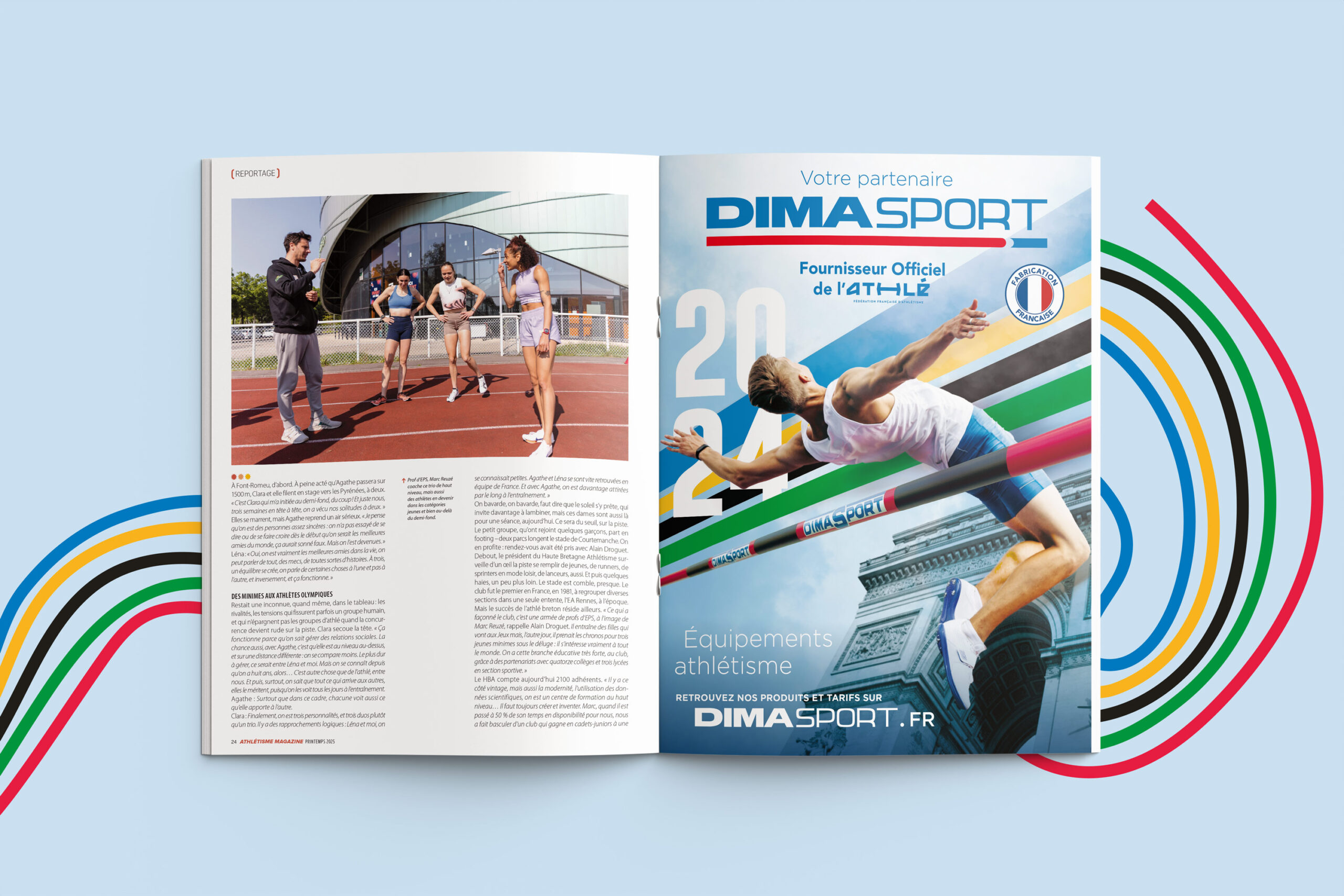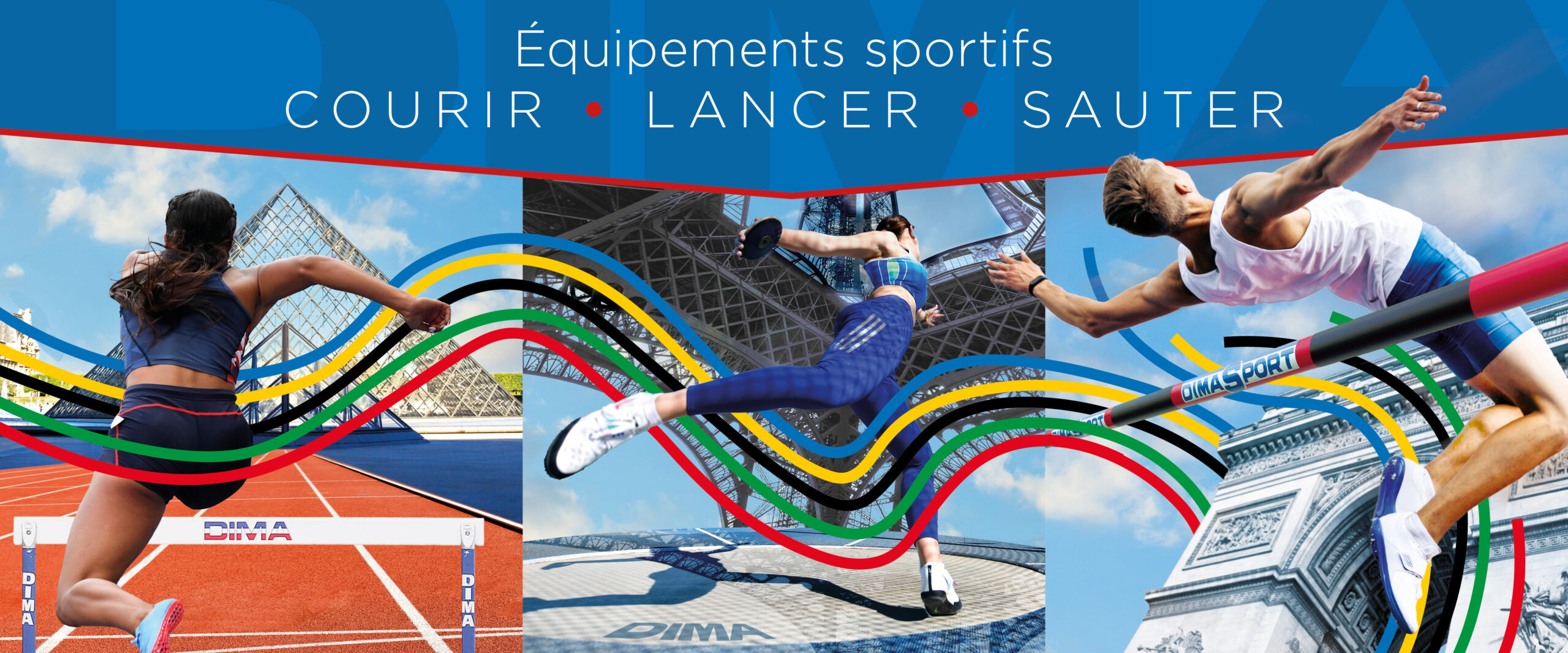 Pour la promotion de la marque DIMA à l’occasion de Paris 2024, j’ai conçu trois visuels dynamiques mettant en avant les produits DIMA, avec le slogan « Courir, Lancer, Sauter ». Le défi était de capter l’esprit de Paris 2024 sans utiliser explicitement les symboles olympiques, pour respecter les droits d’image. J’ai donc opté pour une approche subtile en intégrant cinq rubans aux couleurs olympiques, qui traversent chaque visuel pour créer une continuité visuelle. Chaque visuel inclut un monument parisien emblématique, ajoutant une touche locale. Les créations sont conçues pour être utilisées individuellement ou en frise continue, offrant ainsi une grande flexibilité pour différents supports de communication. Ces éléments visuels unifiés renforcent l’identité de DIMA et son association avec l’esprit sportif de l’événement.